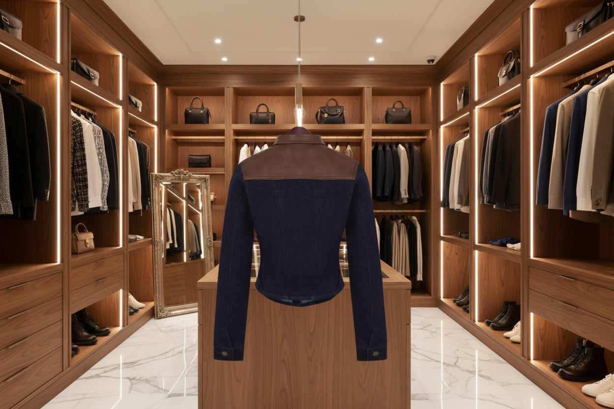 - Denim Leather Mix Fitted Jacket